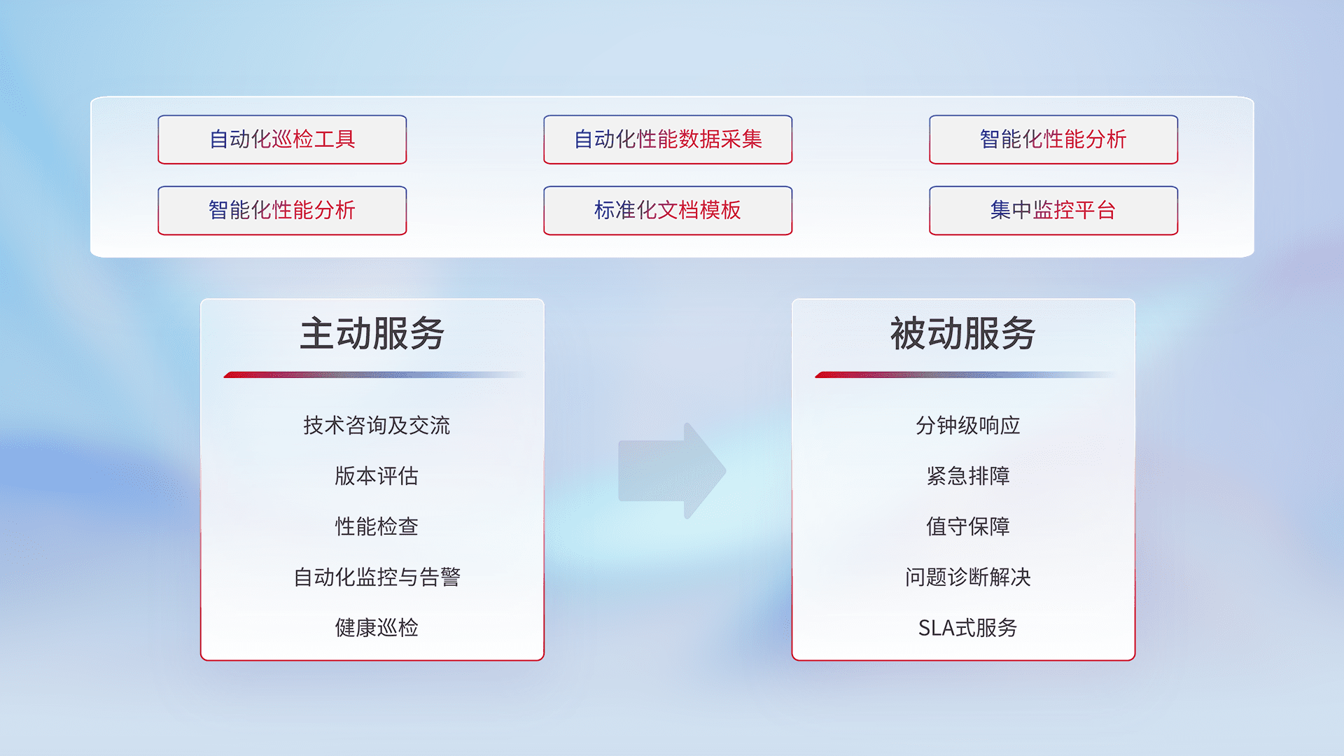 智能化工具和标准化文档,,保障服务质量,,,提供主动服务(包含技术咨询、、、版本评估、、、、性能检查、、、自动化监控与告警、、、健康巡检)和被动服务包含(分钟级响应、、紧急排障、、、、值守保障、、、问题诊断解决、、、SLA服务)。。。